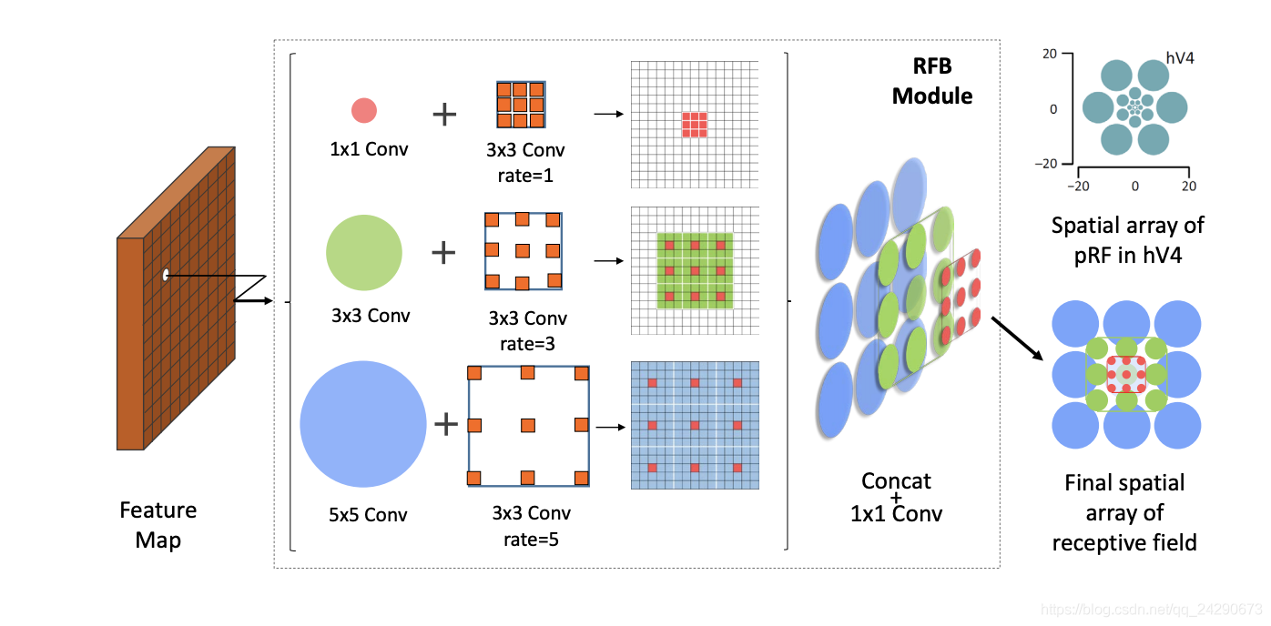 通过将多个分支与不同的卷积核和膨胀卷积组合来构建RFB模块。 多个卷积核类似于不同大小的pRF,而膨胀卷积为每个分支分配单独的偏心率以模拟pRF的大小和偏心率之间的比率。 通过将所有分支合并进行1*1卷积变换,产生RF的最终空间阵列,其机理类似于上边所示的人类视觉系统