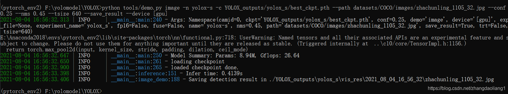 python tools/demo.py image -n yolox-s -c YOLOX_outputs/yolox_s/best_ckpt.pth --path datasets/COCO/images/zhachunling_1105_32.jpg --conf 0.25 --nms 0.45 --tsize 640 --save_result --device [gpu]