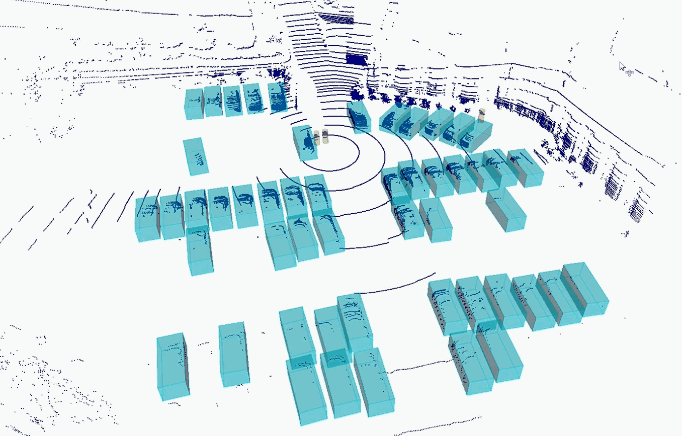 使用模型来自速腾聚餐,具体使用的算法和模型结构未知,也找不到介绍。检测效果比较好,测试结果如下图所示,即使点云稀疏的车也能大部分检测出来。同样测试了检测距离,在平地上,检测汽车的最远距离可达80米,检测行人的距离在30米左右,这对于32线的雷达来说算是不错的成绩了。